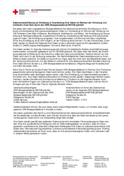 Der DRK-Blutspendedienst NSTOB gGmbH veranstaltet eine Verlosung von 100 limitierten Crew-Sets im Zeitraum 01.10.2025 bis 05.12.2025. Der Gewinn beinhaltet ein Crew-Set bestehend aus Beanie, Bauchtasche, Isolierbecher und Sticker. Pro Person ist lediglich eine Teilnahme möglich.