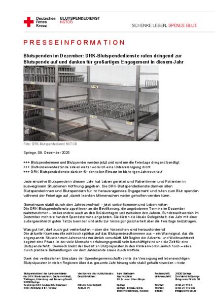 Die DRK-Blutspendedienste appellieren an die Bevölkerung, die angebotenen Termine im Dezember wahrzunehmen – insbesondere auch an den Brückentagen und zwischen den Jahren. Bundesweit werden im Dezember mehrere hundert Spendetermine angeboten. Sie bieten die ideale Gelegenheit, das Jahr mit einer außergewöhnlich guten Tat zu beenden und aktiv zur Versorgungssicherheit über die Feiertage beizutragen.