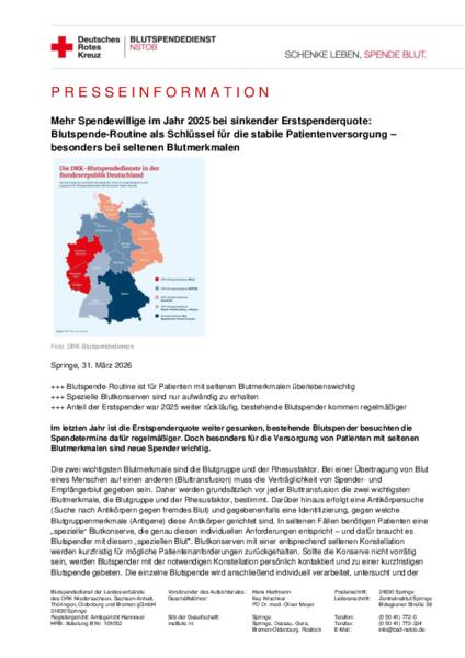Nicht nur der demografische Wandel fordert neue Blutspender, auch solche Fälle wie in Oldenburg profitieren von neuen Spendern. Je mehr Personen Blut spenden, desto größer ist die Chance, eine passende Blutkonserve für Patienten mit besonderen Anforderungen zu finden. Die gemeinnützigen Blutspendedienste des Deutschen Roten Kreuzes (DRK), die rund 75 Prozent der Blutversorgung in Deutschland sichern, verzeichneten im Jahr 2025 ein leicht gestiegenes Blutspendeaufkommen. Insgesamt 3.182.081 Spendewillige sind auf den 40.506 organisierten Blutspendeterminen der DRK-Blutspendedienste erschienen. Das entspricht einem moderaten Plus von knapp 1 % gegenüber dem Vorjahr.