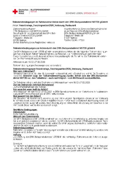 Teilnahmeberechtigt ist jeder, der das 18 Lebensjahr vollendet hat und in Deutschland wohnt. Ausgenommen sind Mitarbeiter des DRK-Blutspendedienst NSTOB sowie Angehörige. Die Teilnahme ist kostenfrei, eine Mehrfachteilnahme ist zulässig. Bestehen bezüglich der Teilnahmeberechtigung Zweifel, behält sich der DRK-Blutspendedienst NSTOB vor, den Teilnehmer (auch nachträglich) vom Wettbewerb auszuschließen. Die Teilnahme erfolgt durch das persönliche Erscheinen beim Check-In in einem unserer teilnehmenden Spendeorte. Diese sind das DRK-Spendezentrum an der Marienkirche Neubrandenburg, das DRK Institut Rostock sowie das DRK Institut Dessau.